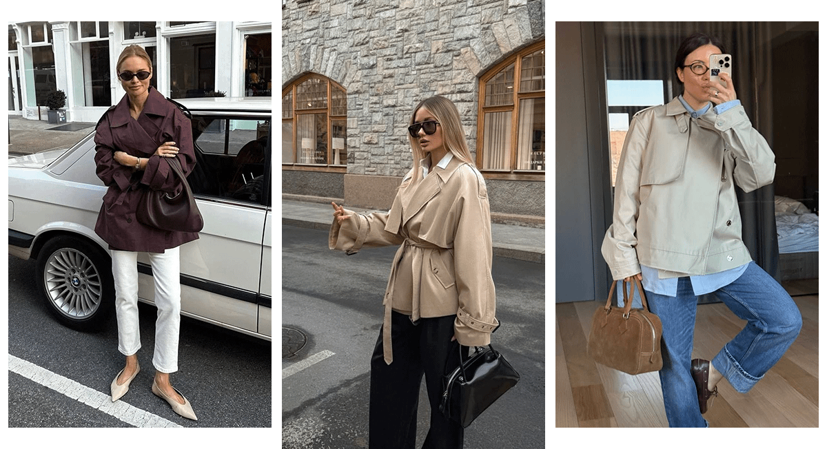 Если тебе уже надоел классический удлиненный тренч или ты чувствуешь себя в нем не очень комфортно, примерь укороченную версию. Самые популярные этой осенью — модели в бежевом, коричневом и сером цветах.