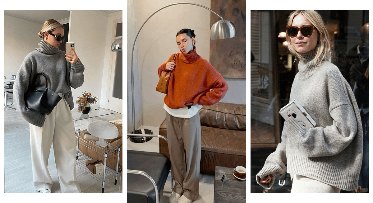 Теплый свитер с высоким однослойным или двухслойным воротником тебе тоже пригодится. Вещь можно надеть с джинсами и брюками, а также вписать в образ с мини-юбкой или платьем-комбинацией. Особенно эффектно выглядят оверсайз-свитеры с широкими прямыми рукавами.