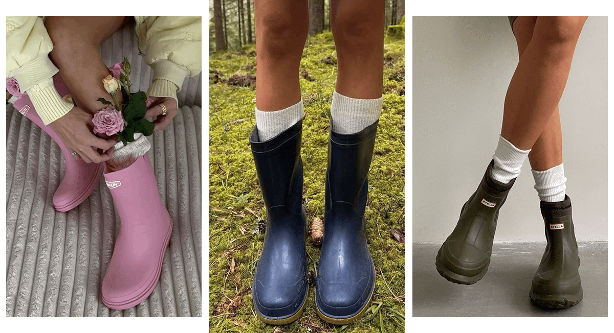 Не бойся выглядеть странно или неуместно — резиновые сапоги давно стали модными. Особенно популярны модели в ярких цветах: розовом, зеленом, голубом. Чтобы ногам было комфортно, надень удлиненные плотные носки.
