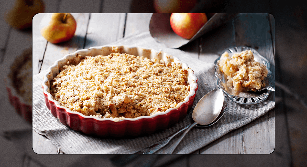 Этот простой в приготовлении десерт родом из Англии. Его прелесть в контрасте теплой, ароматной фруктовой начинки и рассыпчатой, хрустящей крошки.