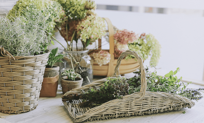 Плетеные и металлические декоративные корзины, подвесные корзины-кашпо и цветочные кашпо с бамбуковым декором различных форм способны придать любому саду немного деревенского шика в стиле прованс. Красочная инсталляция из цветущих растений, таких как петуния, бегония и герань, добавит буйство цвета на фоне общей зеленой картины сада.