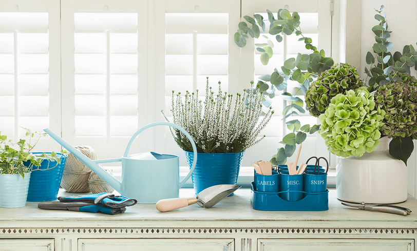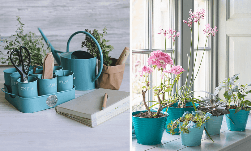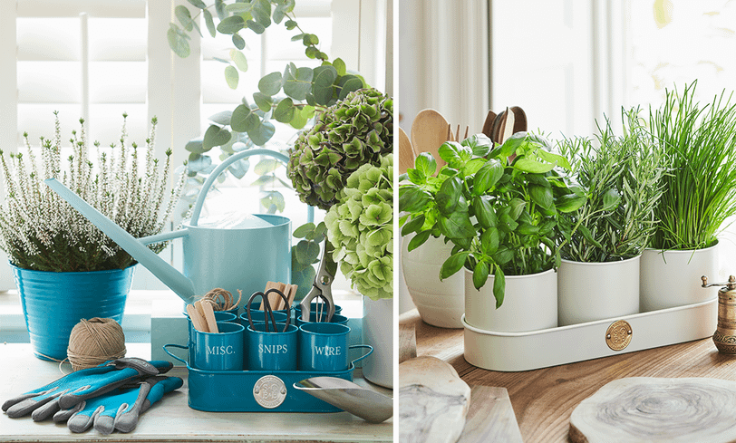 На подоконнике можно разместить не только цветы и травы, но и создать сложную композицию из необычного садового инвентаря. Стильная английская леечка с изящными узким носиком и модным ботаническим принтом в композиции с дизайнерскими садовыми инструментами и эмалированным органайзером станет главным арт-объектом твоего мини-сада и превратит твой балкон в настоящую творческую мастерскую.