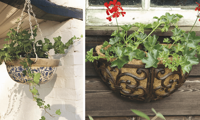 Вертикальные сады идеально подходят для оформления ограниченного пространства. Чтобы создать изящную цветущую стену, посади растения в подвесные кашпо — винтажные керамические или ажурные чугунные со вставкой из кокосового волокна, прикрепив их к стене с помощью декоративных кронштейнов и держателей. Сгруппируй их вместе на разной высоте, чтобы добавить структуру в свой будущий сад и дополни растительную композицию напольными цветочными горшками.