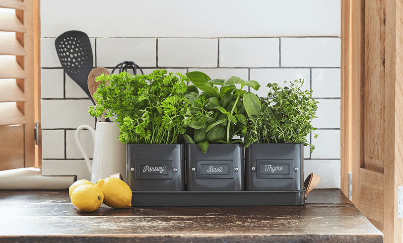 Небольшие эмалированные горшочки на подносе с ручками из натуральной кожи привнесут на твою кухню не только аромат свежих пряных трав, но и нотку актуального дизайна. Их можно расположить на подоконнике или открытой кухонной полке в духе современных трендов. Посади в них низкорослые растения либо налей воду и поставь купленные в супермаркете пучки трав, чтобы во время приготовления блюд ароматная зелень была под рукой.