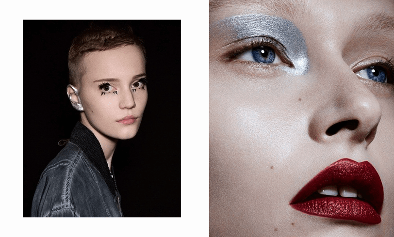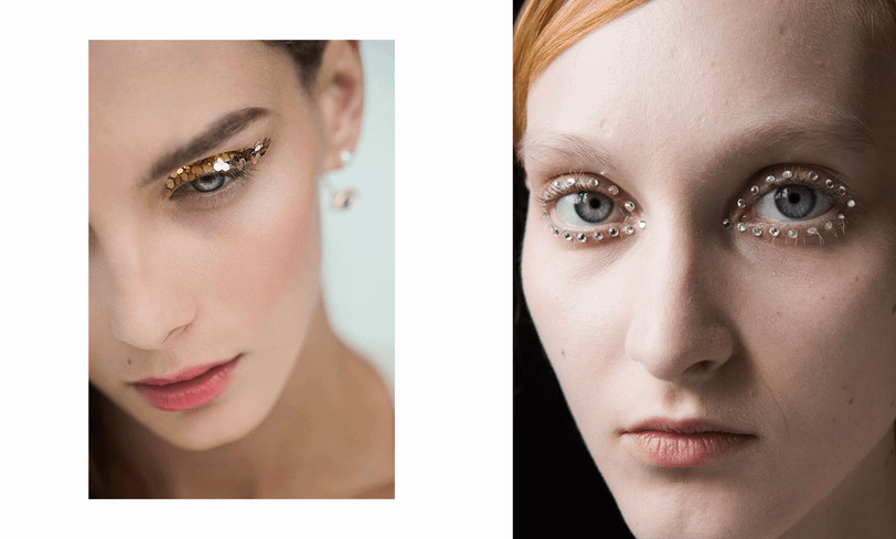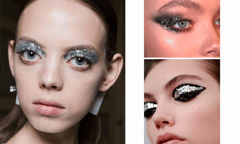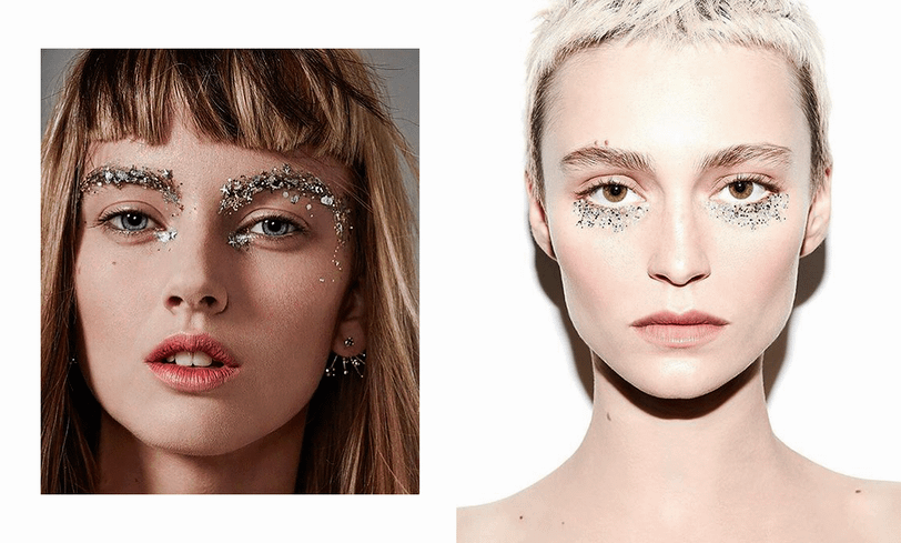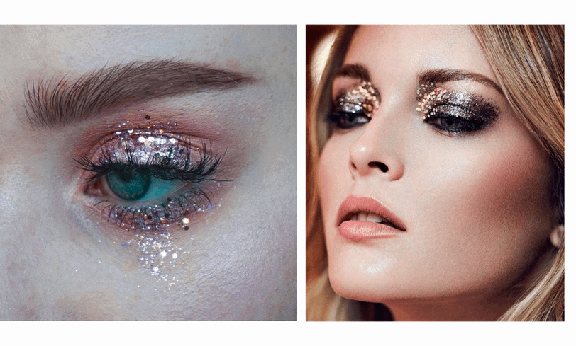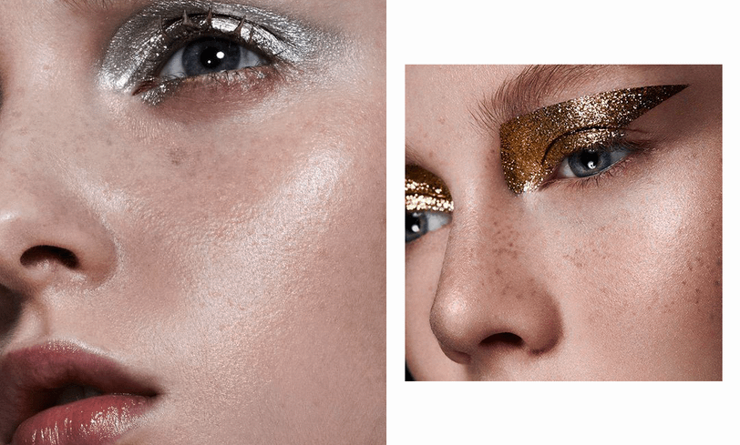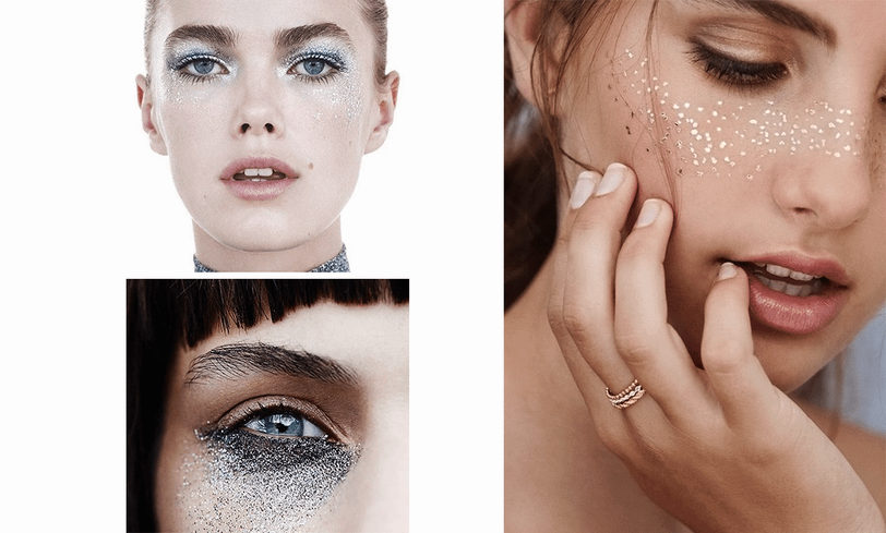 Для этого образа используй пигментированные тени и глиттер с мелкими частицами. Холодные и теплые сверкающие оттенки можно наносить на любую часть лица: на брови, нижние веки или даже в качестве хайлайтера. Если наносишь тени с глиттеров на веки, убедись, что под ними будет база или другие, более плотные тени, чтобы сверкающая пыль не осыпалась в течение вечера. Используй клей для глиттера, если хочешь закрепить частицы на более подвижных частях века или же создать какой-то узор.