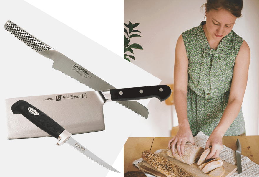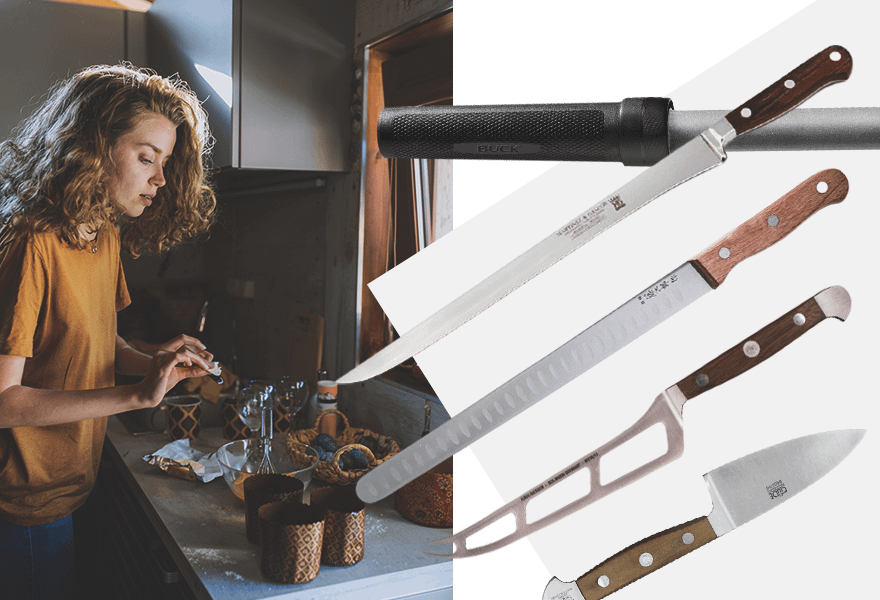 Для начала вполне достаточно приобрести стандартную «кухонную тройку» — набор из трех ножей, которые используются в домашних условиях чаще всего. В него входит шеф-нож общего применения, серрейтор с зазубренным лезвием для резки хлеба, овощей, фруктов и слоеных тортов, а также нож для мелких работ по типу чистки овощей или шинковки лука. Дополнительно можно обзавестись топориком, он пригодится для рубки мяса.