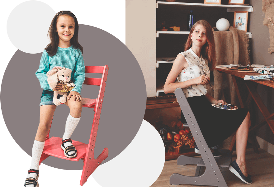 Главная особенность мебели-трансформер заключается в том, что она растет вместе с ребенком. Например, конструкция стула «Конёк» оснащена регулируемыми сидением и опорой для ног, что позволяет удобно расположиться ребенку любого возраста. Широкая спинка стула имеет анатомические изгибы, позволяющие снизить нагрузку на позвоночник и предупредить развитие сколиоза.