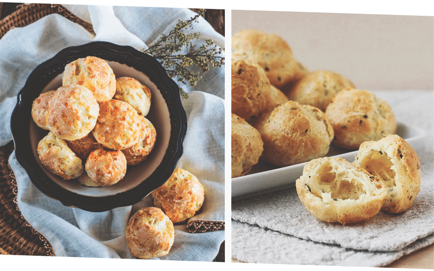 Выпечку из заварного теста с сыром — gougères – во Франции часто подают во время дегустации вин. Для гужеров используют сыры Конте или Грюйера, их можно заменить другими сортами с ярко выраженным вкусом.