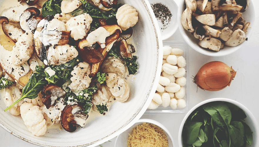 Нагрей духовку до 200 градусов, нарежь грибы ломтиками и выложи их на форму, смазанную маслом. Добавь к ним ньокки, шпинат и покрошенный сыр, затем отправь в духовку на 25–зо минут. Перед подачей сбрызни блюдо оливковым маслом.