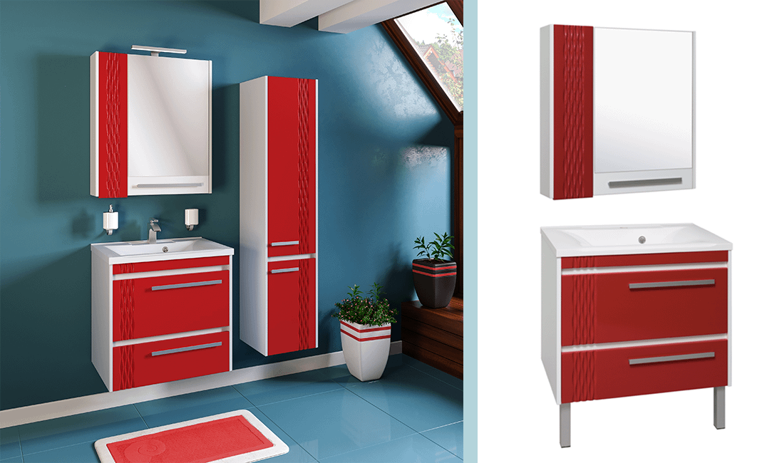 Яркая мебель в красном цвете будет хорошо смотреться на фоне виниловых обоев или мозаичной плитки более крупного формата в холодных, светлых оттенках.