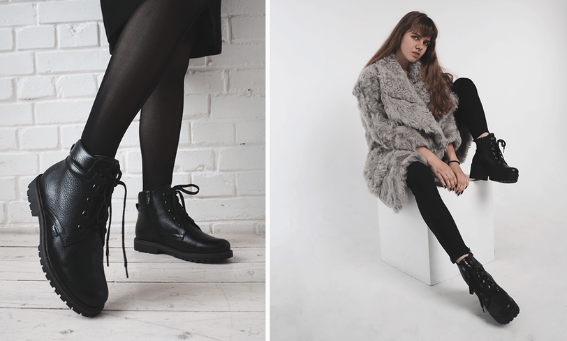 Грубые ботинки со шнуровкой, на толстой рифленой подошве устойчивы и удобны, что позволяет сохранять равновесие даже на скользких поверхностях. Они отлично сохраняют тепло и быстро сохнут, не позволяя ногам замерзнуть, поэтому идеально подходят для холодного времени года.