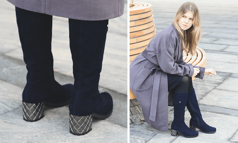 Велюровые темно-синие сапоги с круглым носком украшает гламурный зеркальный каблук, декорированный геометрическими элементами. Необычный дизайн сапог дополняется практичностью и удобством колодки, небольшой каблук выглядит женственно, а ноги не устанут от долгой ходьбы.