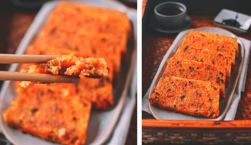 Это вариация традиционного китайского Luo Bo Gao из дайкона. Здесь вместо редьки будет использоваться морковь — с ней неподготовленный человек не смутится горьковатого привкуса лакомства, к тому же корнеплод подарит пирогу аналогичную текстуру и приятный оранжевый оттенок.