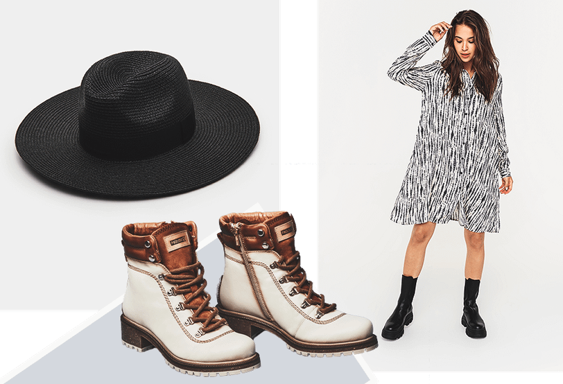 Шифоновое платье-мини, кожаная косуха и ботинки — приземленность обуви делает этот образ еще романтичнее. Советуем остановиться на игривом платье-мини или более скромном миди с цветочным принтом или любым другим мелким узором. Такую вещь, несмотря на легкость и воздушность ткани, приятно и уместно забрать с собой и в осенне-зимний гардероб.