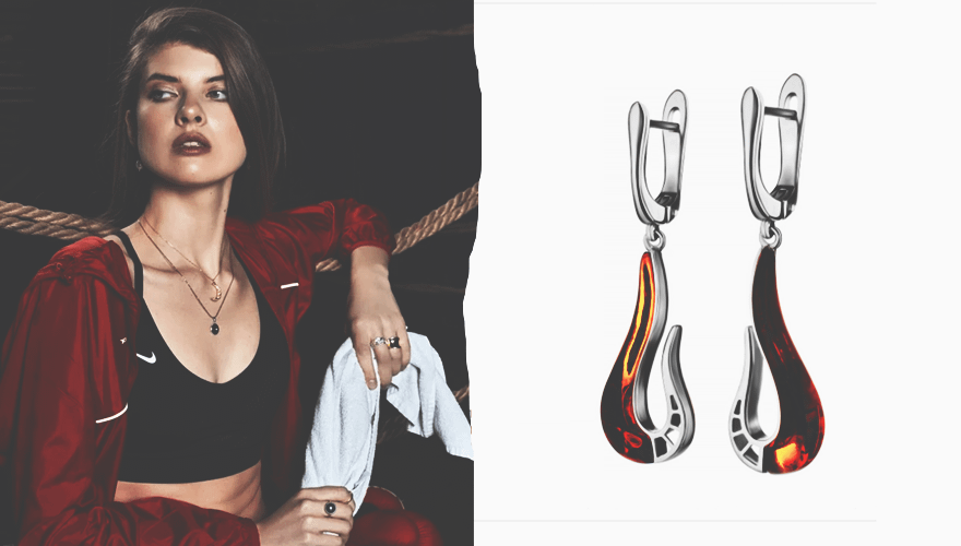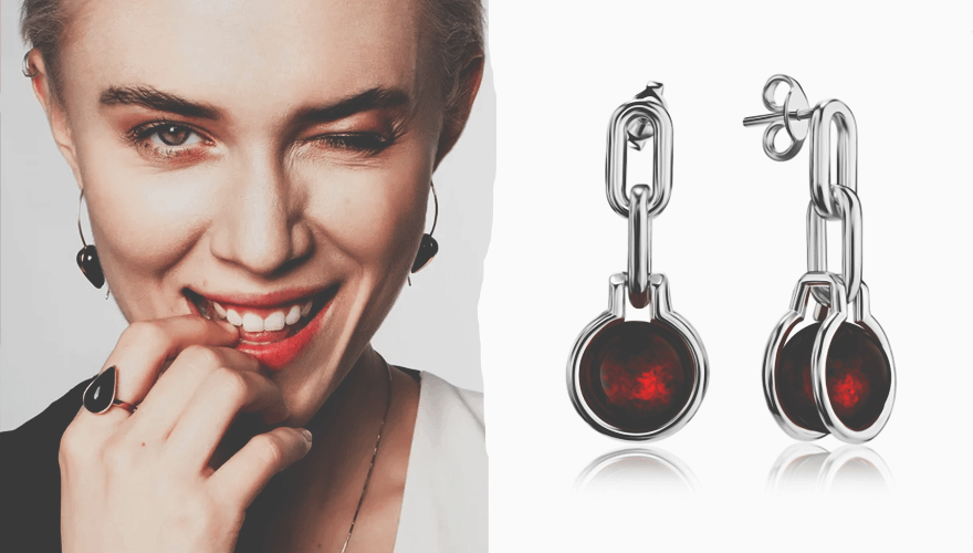 Любительницам простых, непринужденных, но при этом интересных образов приглянутся изящные аксессуары, выполненные в смешанном стиле классики и хай-тек. Наш безусловный фаворит — очаровательные серебряные серьги с небольшим круглым янтарем вишневого оттенка. Интереснее всего они будут смотреться в сочетании с бордовым брючным костюмом в полоску, белой классической рубашкой oversize и укороченными брюками или платьем-футболкой и широкими джинсами.