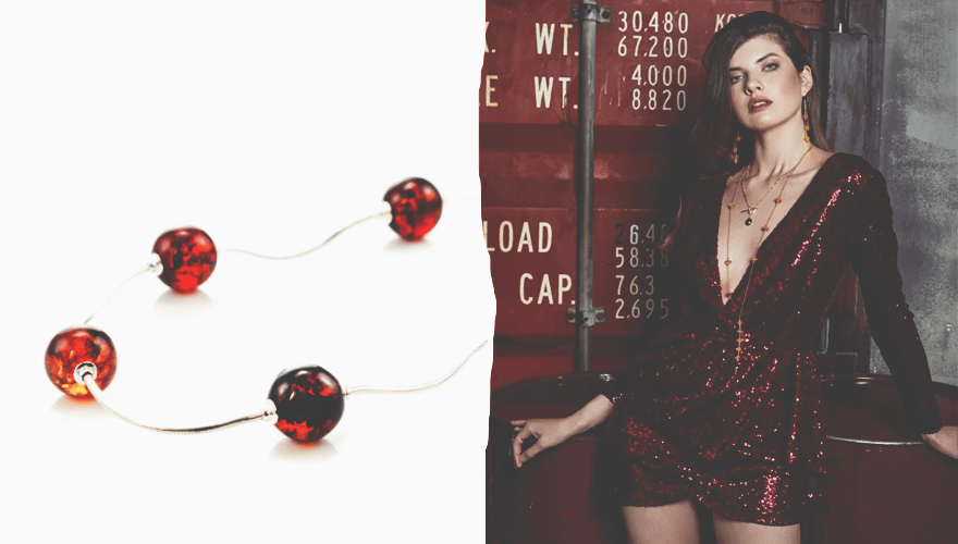 Женственное колье-цепочка с переливающимся вишневым янтарем станет стильным дополнением как роскошного вечернего туалета, так и повседневного комплекта. Идеальный вариант — носить его с расклешенными брюками и легкой блузой с v-образным вырезом или двубортным платьем-смокингом на голое тело. Еще совет: сочетай аксессуар с тонкими цепочками разной длины, чтобы добиться многоярусности, которая сейчас в тренде.