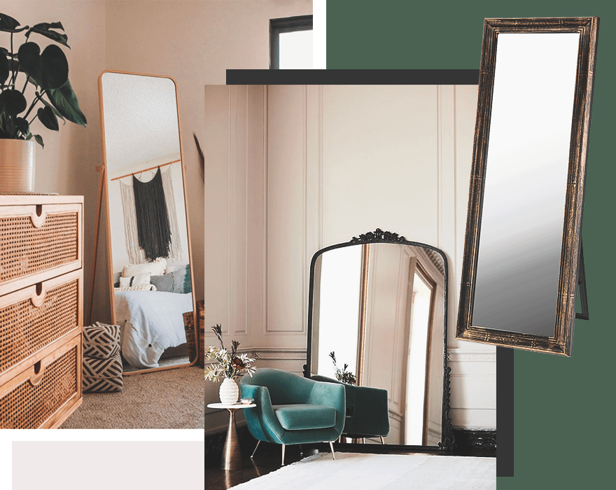 Напольное зеркало понравится тем, кто часто любуется собой в полный рост. Но есть у него и функциональные плюсы. Такой аксессуар освобождает от надобности искать место на стене, а благодаря довольно внушительному размеру добавляет больше света и визуально увеличивает пространство. Обрати внимание на рамку. Классическая, конечно, тоже подойдет, но выполненная в стиле барокко или винтаж будет смотреться более интересно и фешенебельно.