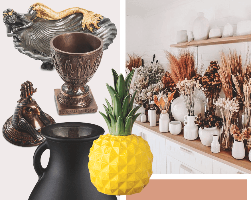 Свежие цветы добавляют интерьеру уюта, их аромат — свежести, а поставленные в красивую вазу необычной формы, они будут еще и стильно смотреться. Нам нравятся модели в виде ракушки с русалками, ананаса, роскошного вечернего платья, женской сумочки, древнеегипетского бога Ибиса и древнегреческой амфоры. Стильная ваза даже без цветов способна завершить интерьерный ансамбль или заполнить пустующее пространство.