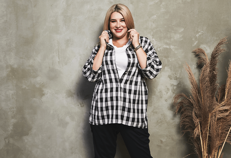 Еще одно правило, которого стоит придерживаться при подборе вещей нестандартных размеров, — хорошая ткань. Синтетика низкого качества визуально исказит твою фигуру. Лучше обращать внимание на плотные материалы, которые выделят ее достоинства. Хлопок, трикотажное полотно, лен или шерсть — одежда из этих тканей станет отличным выбором. Хорошо будет смотреться и, к примеру, шелк, особенно если ты предпочтешь свободный фасон. Мягкие, легкие, струящиеся ткани тоже будут выигрышно смотреться на тебе, повторяя изгибы тела.