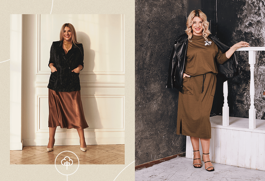 Еще одно правило, которого стоит придерживаться при подборе вещей нестандартных размеров, — хорошая ткань. Синтетика низкого качества визуально исказит твою фигуру. Лучше обращать внимание на плотные материалы, которые выделят ее достоинства. Хлопок, трикотажное полотно, лен или шерсть — одежда из этих тканей станет отличным выбором. Хорошо будет смотреться и, к примеру, шелк, особенно если ты предпочтешь свободный фасон. Мягкие, легкие, струящиеся ткани тоже будут выигрышно смотреться на тебе, повторяя изгибы тела.