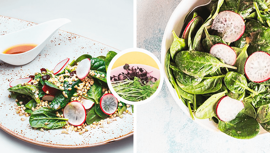 Разнообразие овощей — шпинат, брокколи, микрозелень гороха и редиса даст ощутимую пользу для организма. Овощи богаты витаминами A, B, РР, а также калием, цинком и магнием, которые улучшают иммунитет, пищеварение, работу сердца и сосудов.