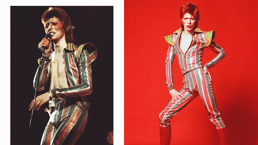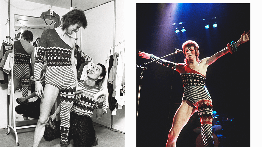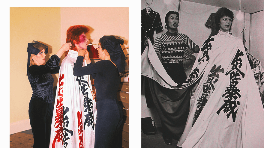 Он-то и скрывался за атласным плащом. Костюм был выполнен из трикотажа с различными принтами и текстурами. Он настолько запомнился фанатам, что позже выкройку комбинезона пытались повторить авторы журналов для любителей кройки и шитья. Для ношения андрогинных нарядов вроде «одноногого» костюма Боуи общался с оннагата Бандо Мамасабуро — одним из самых видных актеров театра кабуки. Оннагата — это мужчина, отыгрывающий женские роли.
