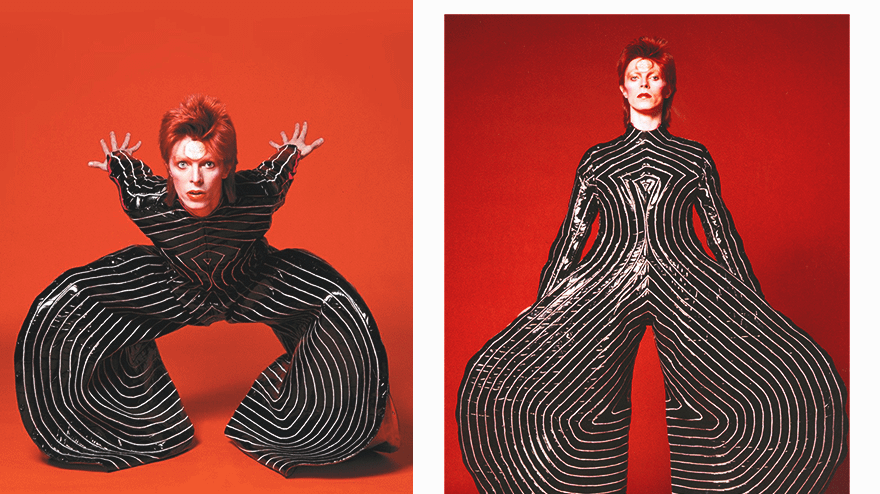Его еще называют скафандром — за то, что в этом наряде Боуи нередко исполнял Space Oddity, особенно во время тура Ziggy Stardust. Музыкант отмечал, что создавал сингл под влиянием фильмов Стэнли Кубрика, в частности «Космической одиссеи 2001», так что перед Кансаем и другим дизайнером артиста Фредди Буретти стояла непростая задача: костюм тоже должен был отражать видение режиссера. Вышел кислотный микс в духе «Заводного апельсина».