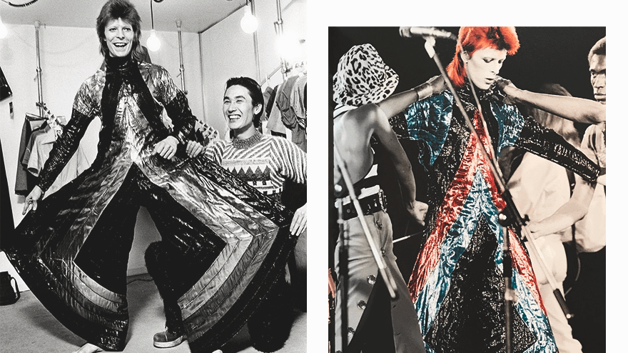 Интересно, что фонетически написанные на костюме фразы переводятся как имя певца, в то время как буквально фраза означает выражение one who spits words in a fiery manner — «тот, кто изрыгает слова, словно огонь выбрасывает языки пламени». Сейчас мы наблюдаем пересечение культур — для нас подобные приемы в дизайне костюма стали обыденными. А вот в 70-е японская азбука не появлялась на западной сцене — наряд Дэвида символизировал дебют японской эстетики в Европе и США. Одетый в плащ, Боуи невольно стал законодателем новых порядков в поп-культуре.