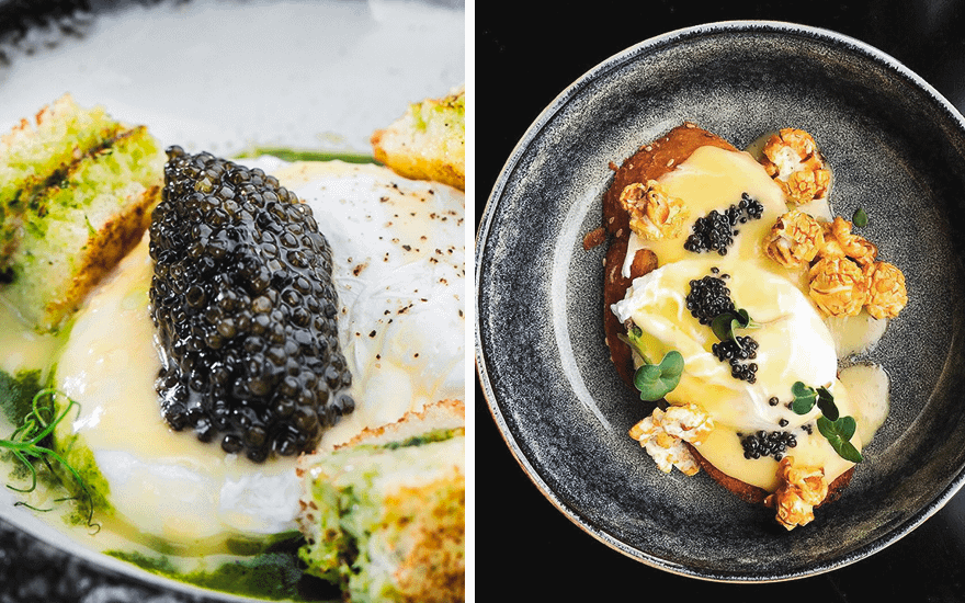 2. Яйцо пашот на тосте с черной икрой и рукколой