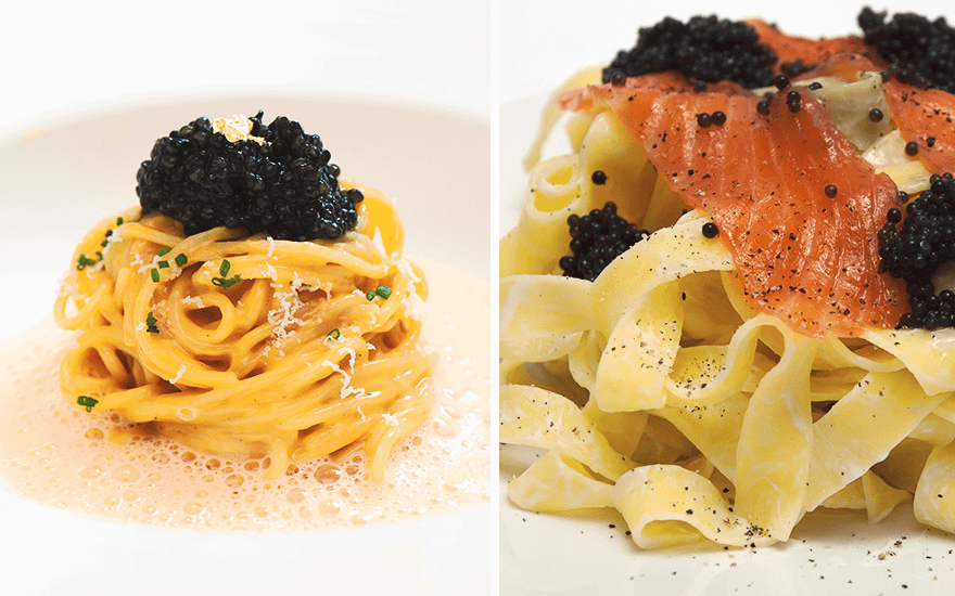Выложи пасту на тарелку, сверху полей соусом и положи в центр пару чайных ложек черной икры.