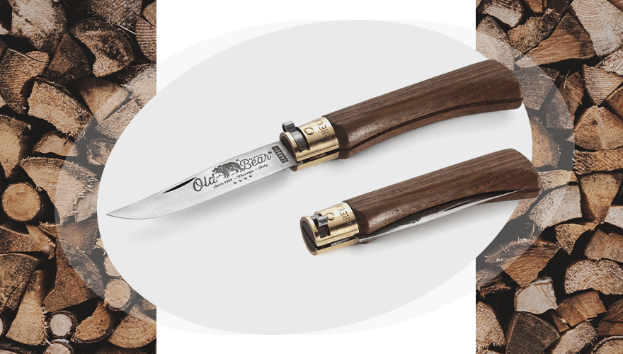 В основе клинка — высокоуглеродистая сталь с закалкой до 57–58 HRC, благодаря чему он не гнется и надолго удерживает заточку. Рукоять ножа сделана из натуральной древесины орехового дерева и обладает высокой прочностью.