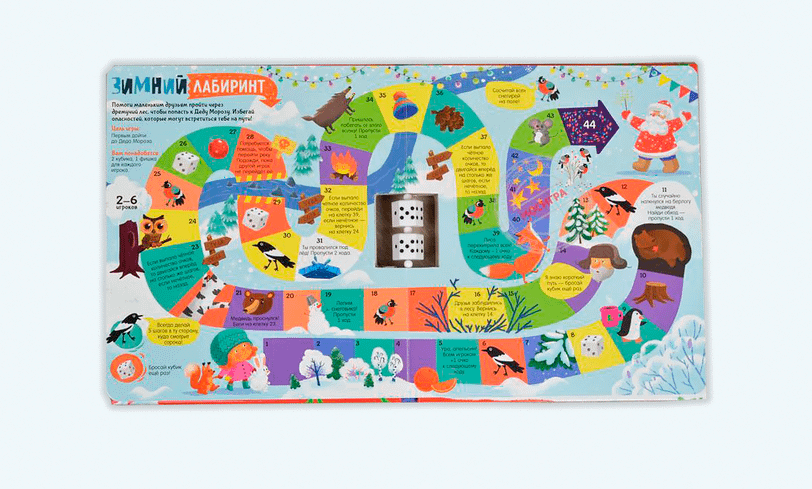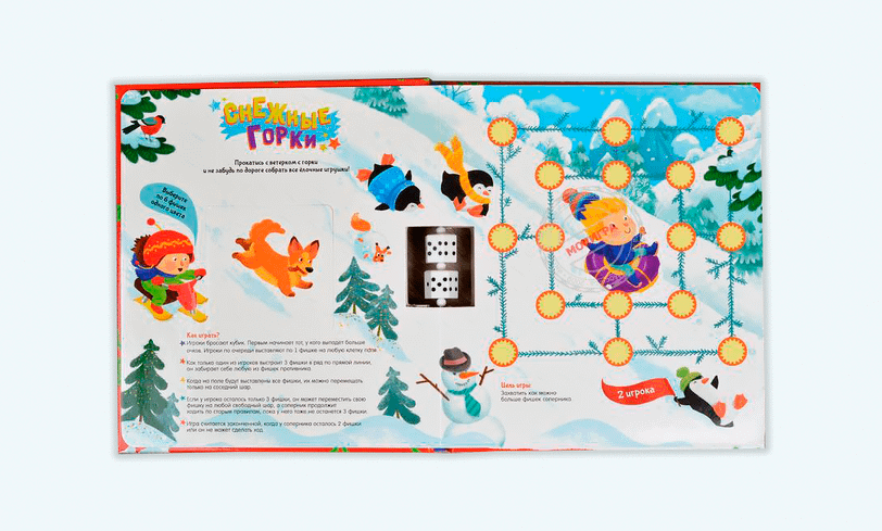 Детям от 6 лет понравится тематическая новогодняя книга из специальной серии издательства «Клевер». В ней пять игр разных типов, и все, что для них понадобится: фишки в секретном кармашке и два кубика в переплете. Здесь есть как простые «бродилки», так и хитрые стратегии.