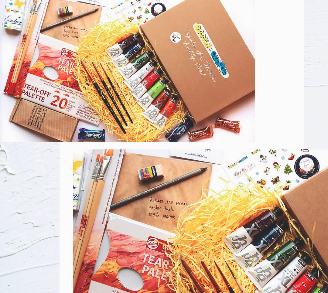 Внутри подобранные друг к другу товары для творчества, новогодний сюрприз, сладкое лакомство и видео мастер-класса, где рассказывается, как использовать материалы из бокса. Докупать ничего не придется — в подарке уже есть все необходимое. Тебе нужно только выбрать технику рисования.