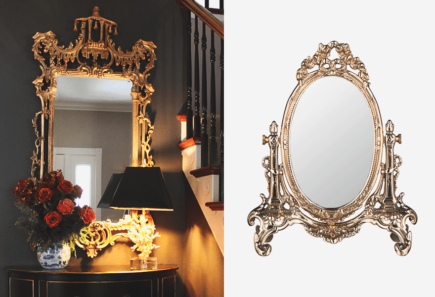 Зеркало в резной латунной раме не просто смотрится роскошно: оно полностью сделано из отражающих свет материалов, поэтому оно не только декоративное, но еще и функциональное. Визуально увеличивает пространство, добавляет света и уюта, а кроме того, выглядит, как старинный арт-объект. Особенно хорошо такой аксессуар будет смотреться в небольшой, темной комнате, которой не хватает объема и индивидуальности.