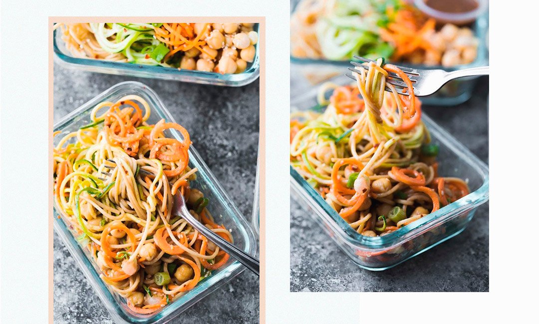 Отвари пасту, промой ее холодной водой и поставь остывать. Разложи пасту по контейнерам, добавь к ней кабачковую и морковную лапшу, а также нут. Посыпь зеленым луком и кунжутом.