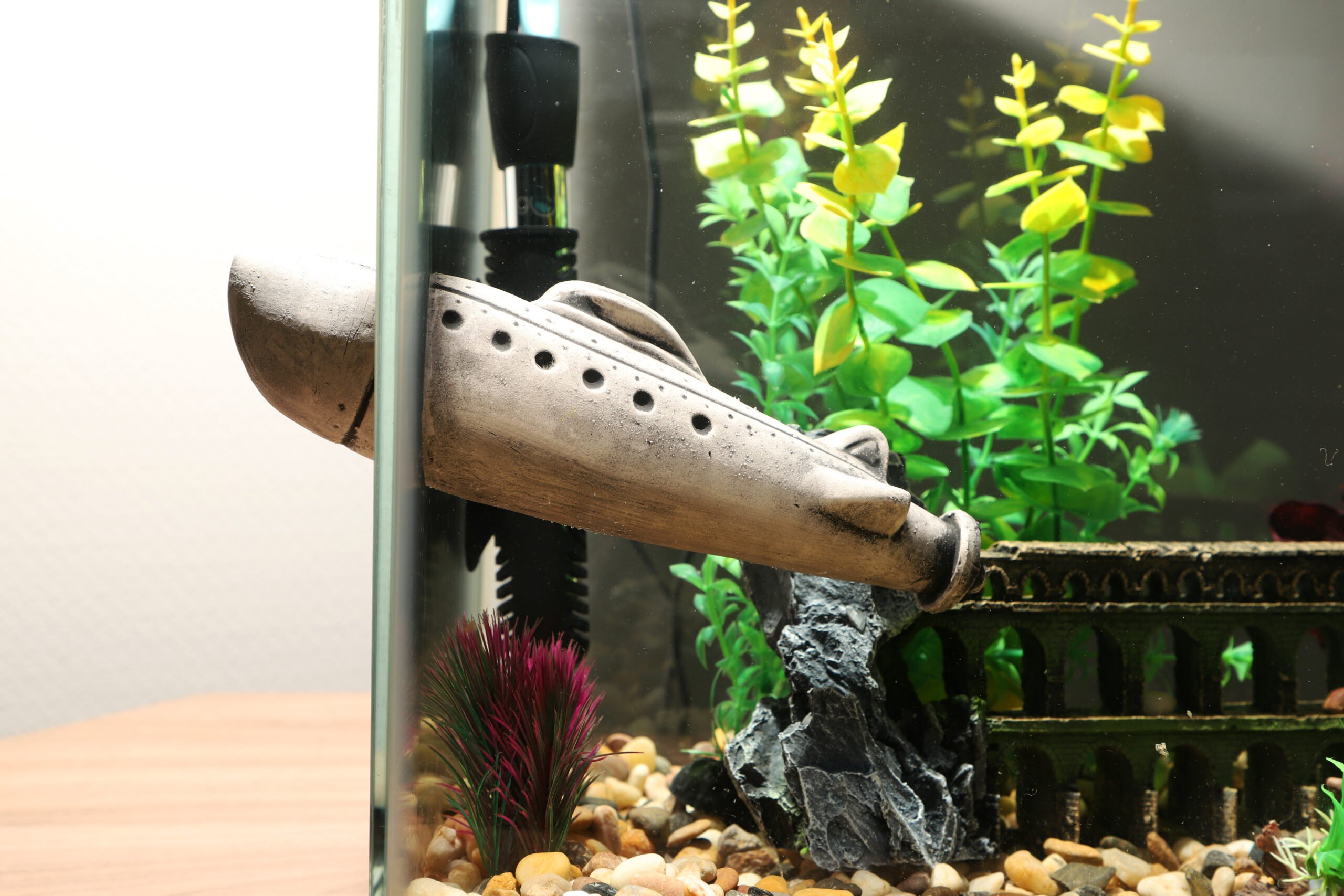 Для маскировки оборудования подойдут элементы из коллекции «Притяжение» от Laguna AQUA. Подводные лодки и летающие тарелки, будто пролетающие сквозь аквариумное стекло, не только отвлекут внимание от технических проводов, но и придадут композиции оригинальность. А если фон оформить фактурной панелью, имитирующей поверхность скал или древних руин, он органично скроет трубки и провода, сделав аквариум более цельным и гармоничным внешне.