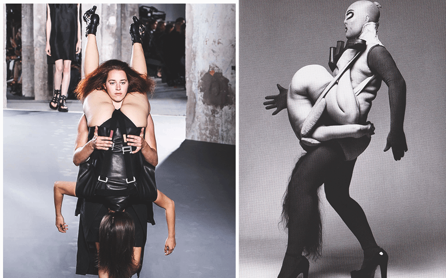 На весенне-летнем показе дизайнер представил моделей с привязанными к ним гимнастками, чем шокировал публику. Представь, какой была реакция зрителей в 1994 году, когда Бауэри имитировал таким образом роды.