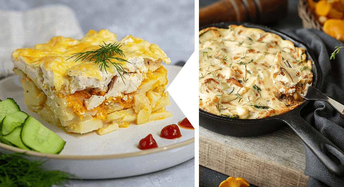 Простое и сытное блюдо можно с легкостью приготовить на сковороде. Запеканка получится особенно нежной, если заранее замаринуешь куриную грудку в смеси из лука, сливок и специй.