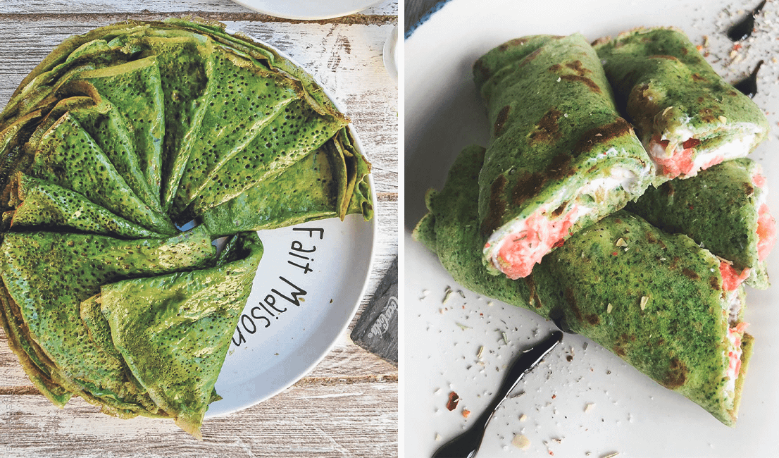 Приготовление: В блендер или кухонный комбайн добавь молоко, протеиновую смесь для блинов и шпинат. Взбивай до получения однородной массы. Поставь антипригарную сковороду на средний огонь и налей кокосовое масло. Как только сковорода прогреется, вылей на нее несколько столовых ложек теста и готовь на одной стороне около 45 секунд. Затем переверни и обжарь блинчик на другой стороне 30 секунд. Повтори те же действия с каждым блинчиком.