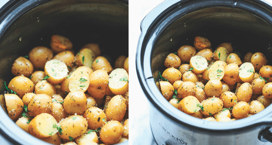 Очисти картошку от кожуры и разрежь плоды пополам. Раздави чеснок или мелко порежь зубчики. Смешай все ингредиенты, после чего выпекай их в духовке при температуре 175-190 градусов до готовности либо томи в толстой кастрюле с крышкой 1,5-2 часа на слабом огне, периодически перемешивая. Подавай ее горячей, посыпав нарезанной петрушкой.