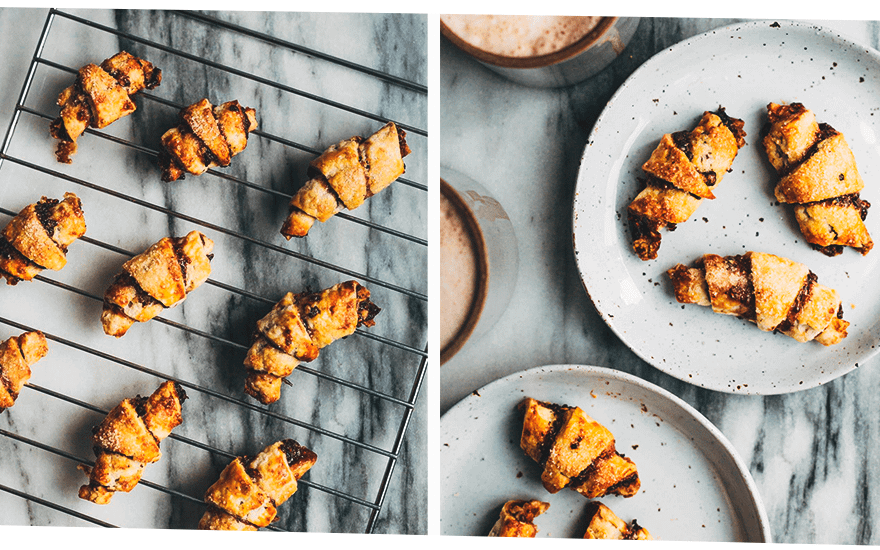 5. Разрежь круг на 12 треугольников, как пиццу. Начиная с основания, сверни треугольник в полумесяц и положи на противень. То же проделай с другими частями теста.