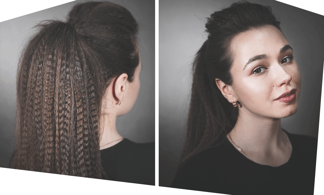 Легкая в исполнении, но не менее эффектная укладка, которая позволит за короткое время привести длинные волосы в порядок. При этом затраченное на работу время будет равно пропорционально густоте волос. Тебе нужно лишь загофрировать пряди и собрать их в высокий хвост. Так ты получишь креативный образ и необходимый объем без начеса.