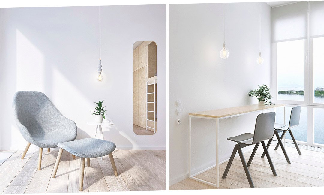 Минималистские интерьеры не терпят ощущения темноты, поэтому особое внимание нужно уделить освещению. Интересный и функциональный прием — добавить тонкие световые панели, рассеивающие мягкий свет, или несколько подвесных светильников строгой геометрической формы. Усилить приток естественного света можно за счет отражающих поверхностей мебели, стеклянных столиков, пустых подоконников или глянцевых наливных полов. Окна должны быть максимально открытыми, а стекла — чистыми: при таких условиях даже самая маленькая комната станет визуально светлее и просторнее.