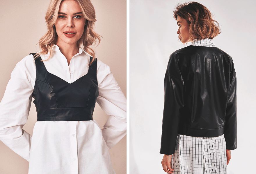 Одежда из экокожи универсальна, с ней можно создать бесконечное количество образов. Так, кожаный кроп-топ можно сочетать с широкими брюками и джинсами-бойфрендами, кожаные брюки будут идеально смотреться с белой рубашкой oversize, а кожаную куртку можно надевать поверх чего угодно. Напомним, что экокожа не имеет ничего общего с кожзамом или дермантином: она гораздо более мягкая, воздухопроницаемая, гипоаллергенная и с улучшенной износостойкостью.