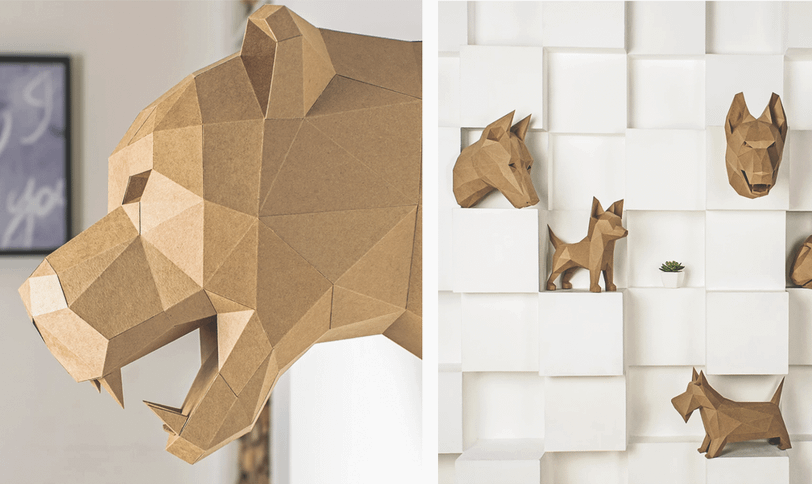 Ты можешь заказать настенную голову, маску или настольную модель животного в виде конструктора. В комплект входит развертка, подробная инструкция по сборке со схемой, линейка, канцелярский нож и клей.