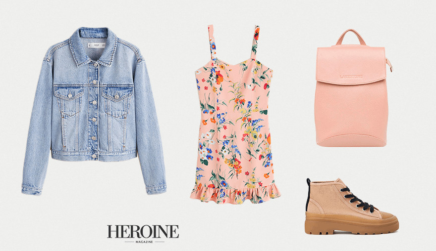 Если вы собираетесь провести вечер вместе, то без женственного наряда не обойтись. Голубая джинсовая куртка, розовое платье в цветочек и классические белые кеды — мы считаем этот комплект идеальным для свидания. Касательно кроя платья — советуем обратить внимание на актуальное расклешенное, с воланами внизу — это добавит образу еще больше нежности. Идеальное дополнение — эффектный розовый рюкзак, в который можно сложить документы, косметичку или бутылку воды, если планируется прогулка по городу.