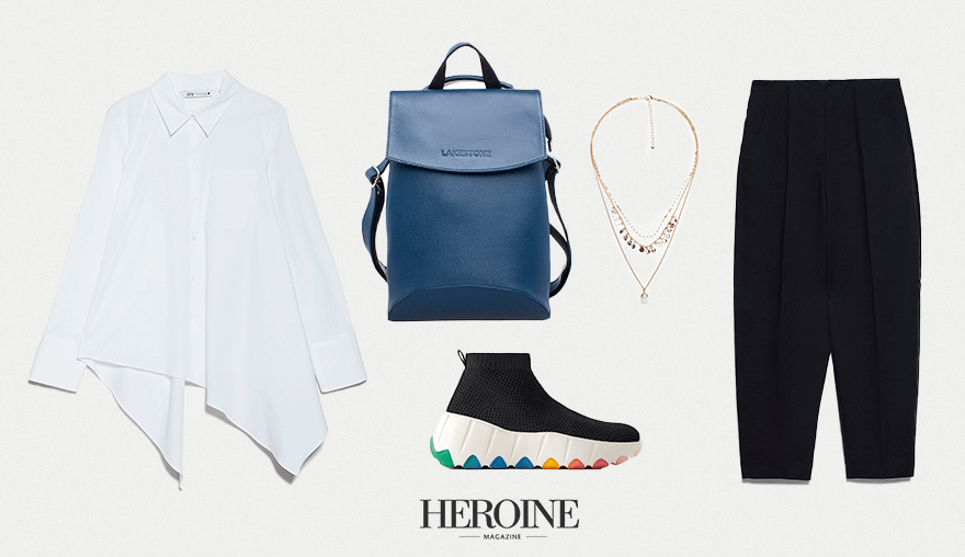 Классическая белая рубашки и темные брюки — универсальное сочетание, которое идеально подойдет для рабочих будней. Ярким акцентом могут стать обувь и аксессуары: можно надеть высокие кеды на объемной цветной подошве, многоярусное ожерелье с камнем, а в пару к ним подобрать вместительный яркий рюкзак, в который легко помешаются документы и планшет. Такой комплект способен не только разнообразить скучный офисный гардероб, но и стать интересным вариантом для вечернего мероприятия.