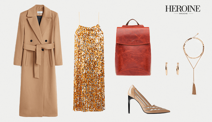 Если хочешь быть заметной на предстоящем мероприятии, присмотрись к платью, расшитому пайетками. Мы выбрали модель прямого кроя, на тонких бретелях — она моментально привлекает внимание и при этом выглядит утонченно. Длинное полушерстяное пальто и остроносые туфли-лодочки подойдут к этому платью идеально. Добавь комбинированное ожерелье с кристаллами, небольшие серьги-кольца и небольшой рюкзак — возьмешь с собой косметичку и бутылку хорошего вина, она точно не будет лишней.