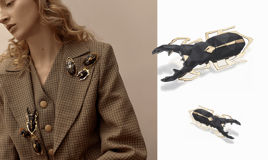 Посмотрев издалека на этого жука-оленя, трудно предположить, что он сделан из позолоченной латуни и английского фарфора. Также в ювелирной коллекции Bug от бренда Vertigo Jewellery Lab можно встретить реалистичных жука-носорога и скарабея. Если верить специалистам по символике, такие украшения обеспечат долгую жизнь, удачу в делах и хорошее настроение. Чтобы удивить прохожих, прикрепи брошь на верхний карман пиджака или фланелевую шляпу с широкими полями — этого будет вполне достаточно.
