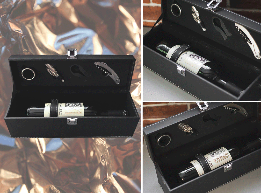Если вы с парнем любите выпить бокал вина вечером или часто устраиваете романтические пикники, этот подарочный набор принесет радость и пользу вам обоим. В роскошном кожаном винном коробе находится бутылка красного испанского сухого вина San Valero с ароматом пикантных специй и свежих фруктов и 4 винных аксессуара для дегустации: нож-сомелье, нож для удаления фольги, воронка и каплеуловитель. С таким набором ему не нужно проходить обучение в винной школе или выращивать собственные виноградники, чтобы заработать репутацию проницательного сомелье.
